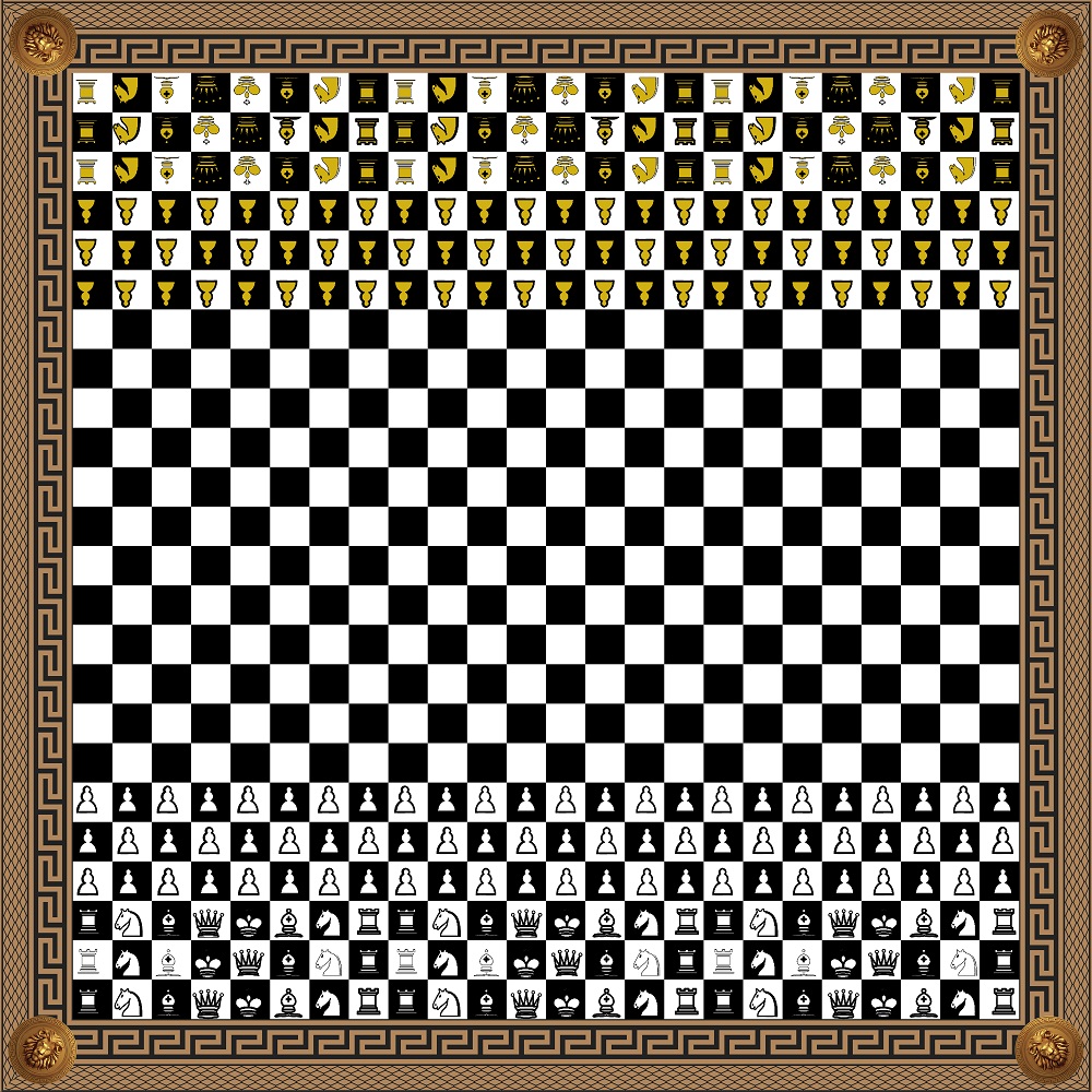 Board: The SWAROS Chessboard consists of 576 squares, 24 rows by 24 columns, on which the chess pieces are placed. It is square in shape and uses two colors of squares, one light and one dark, in a chequered pattern